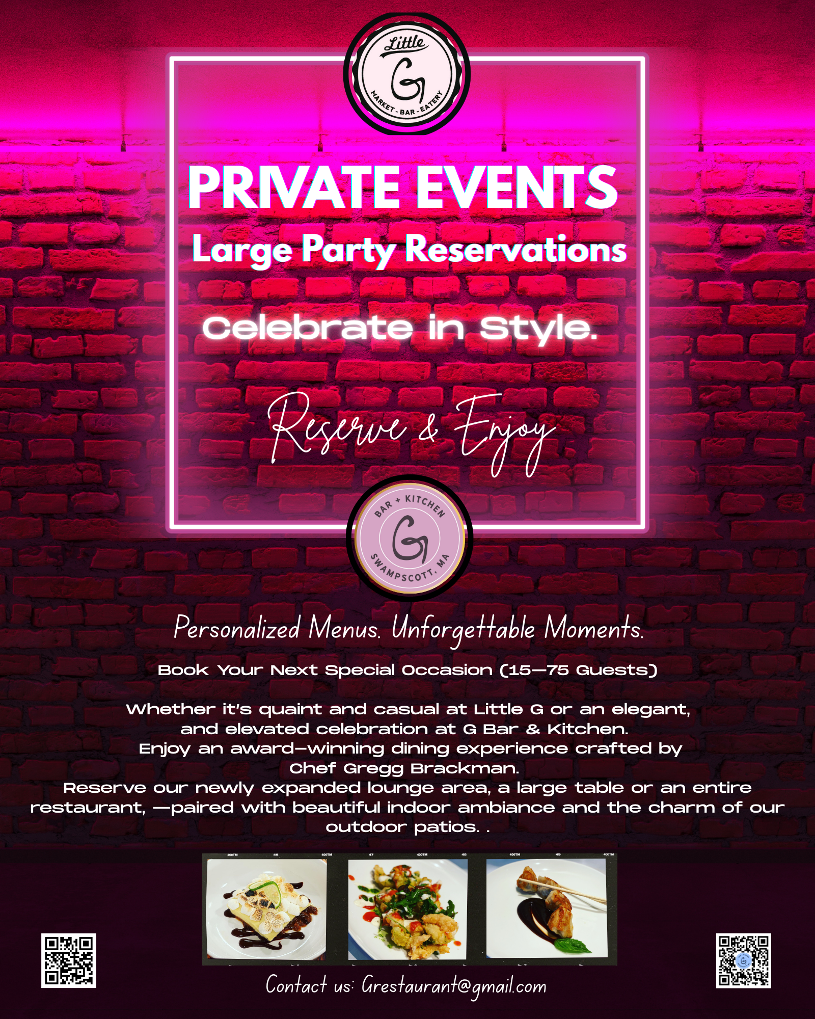 Little G is the perfect venue for your next celebration, be it an anniversary dinner, holiday party or business meeting. Our selections include but are not limited to our Chef 5 Course Tasting. At Little G we aim to create a unique and memory worthy experience. If you prefer to host your event at a home, we are happy to provide personalized catering.